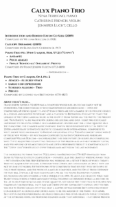 The Calyx Piano Trio — violinist Catherine French, cellist Jennifer Lucht and pianist Nina Ferrigno — has established itself as one of the most imaginative chamber ensembles on the American scene. Founded in Boston in 2001, the group has earned acclaim for its rich ensemble playing and for its dedication to commissioning and performing new music. It has also been hailed for its long-term artistic leadership at the Missouri Chamber Music Festival and Carolina Chamber Music Festival, part of its ongoing commitment to bring chamber music of depth, imagination and vitality to diverse audiences nationwide.